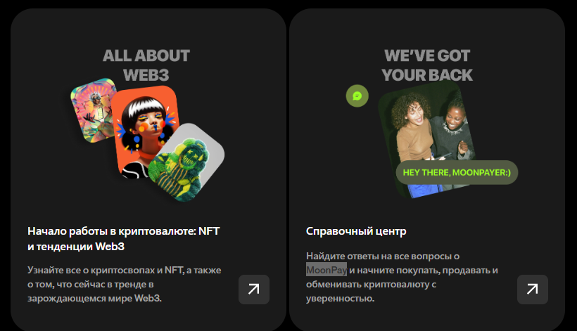 Данные обзоры позволяют быть в курсе основных событий в мире цифровых активов. Также есть специальный справочный центр для новичков, где они узнают про основные принципы работы MoonPay и смогут уверенно чувствовать себя на площадке.