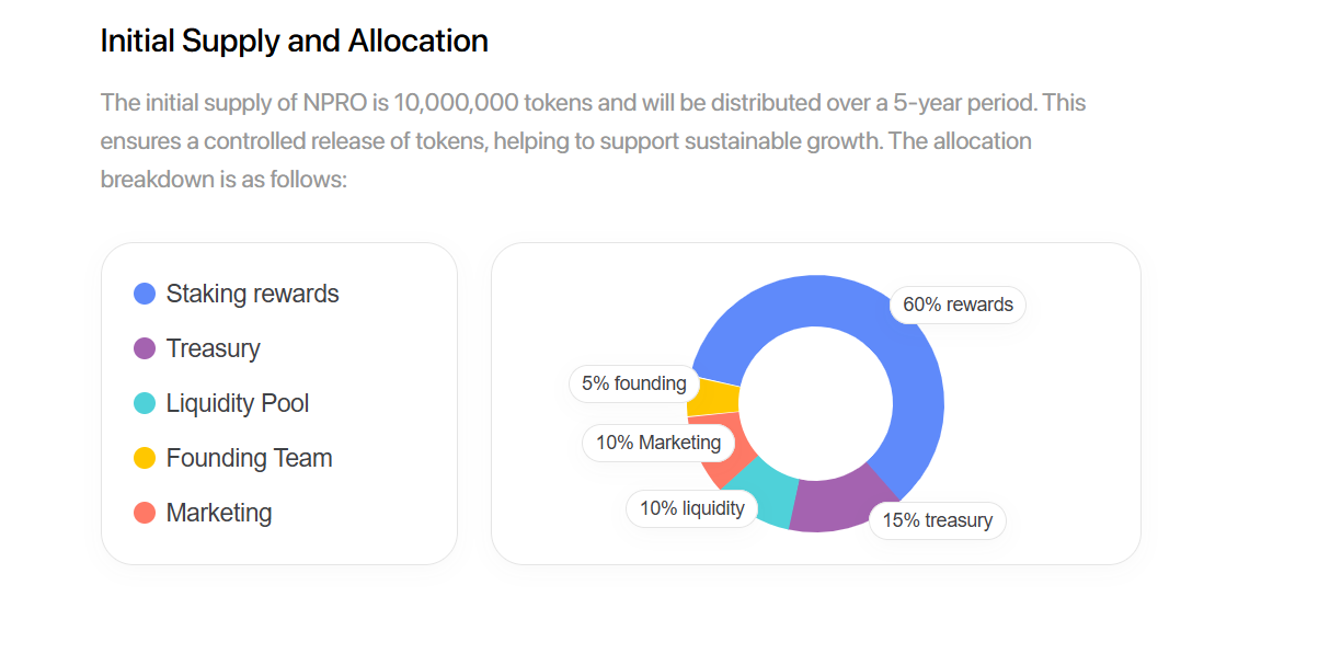 Токен проекта открывает доступ к премиум-функциям в экосистеме NEAR. Держатели смогут платить уменьшенную комиссию. Первоначальный запас монет составляет 10 000 000 NPRO, и он будет распределен в течение 5 лет. Из актуальной токеномики:
