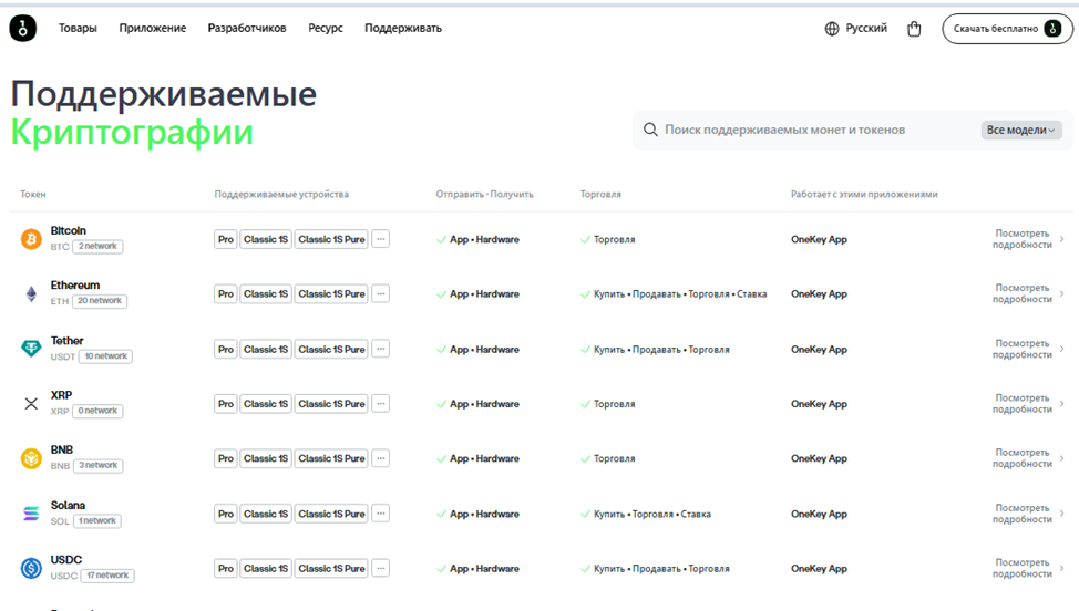 Кошелек «Ван Ки» поддерживает активы из 53 блокчейнов, включая токены сетей ERC-20, BEP-20, TRC-20. Количество совместимых монет постоянно растет, анонсируется в официальном Твиттере @OneKeyHQ. Актуальный список опубликован на сайте OneKey SO. Быстро проверить редкий токен на совместимость с приложением или аппаратным кошельком можно при помощи встроенного поиска.