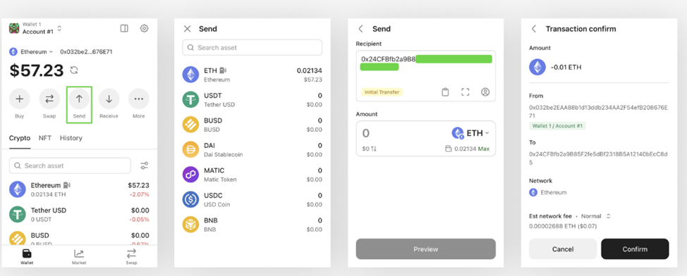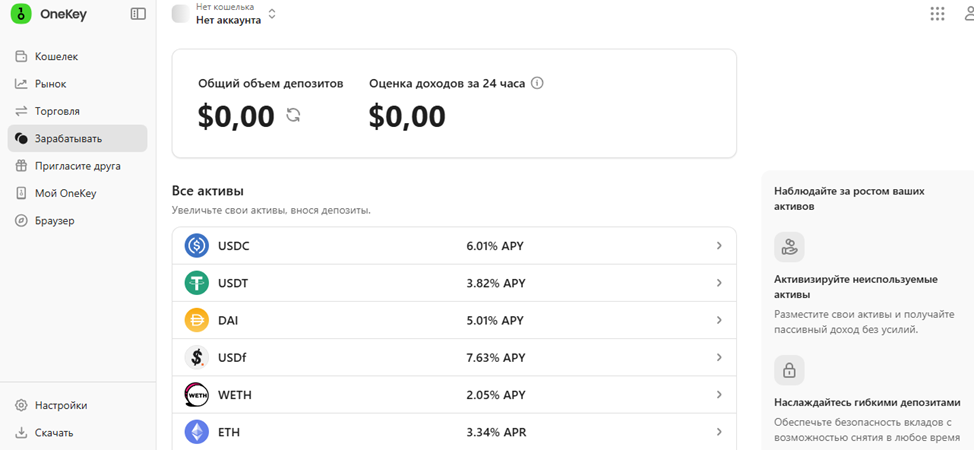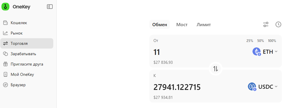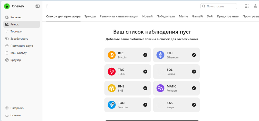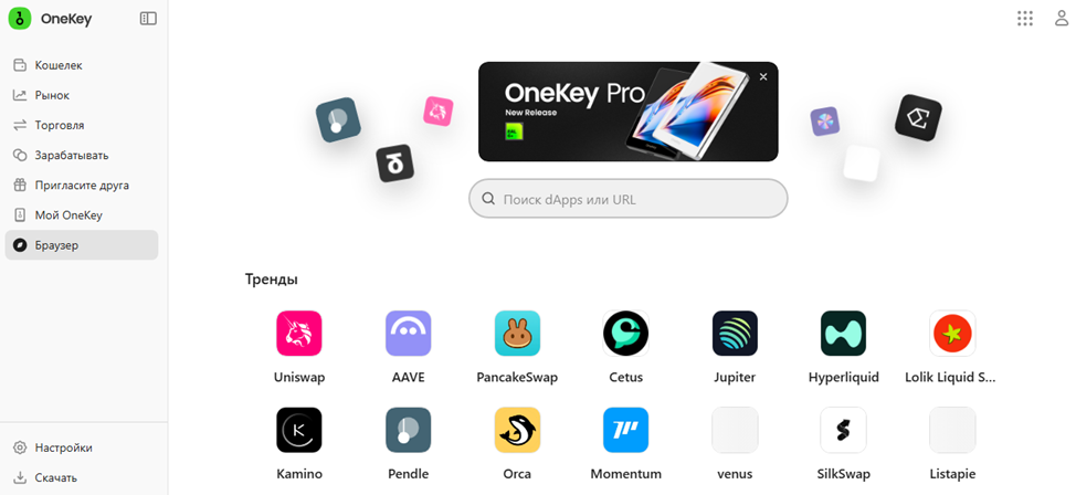 Кроме хранения, получения и отправки крипты, Onekey Wallet предлагает клиентам несколько интегрированных дополнительных сервисов. В разделе «Рынок» можно отслеживать основные параметры криптовалютных активов: цена, тренды, рыночная капитализация и другие.