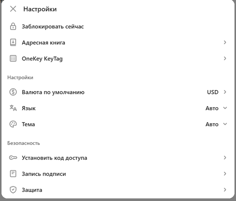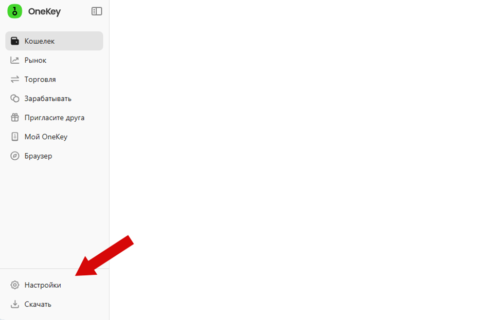 Настройка кошелька One Key wallet производится в одноименном разделе. Кнопка расположена внизу основного меню.