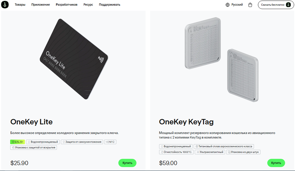 - OneKey Lite за $25,90 — компактная карточка для безопасного хранения и и простого применения Seed-фразы. Продукт совместим только с OneKey Pro и OneKey App;