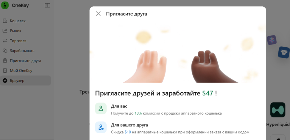 Реферальная программа «Пригласите друга» предлагает заработать до 18% с продажи аппаратного кошелька.