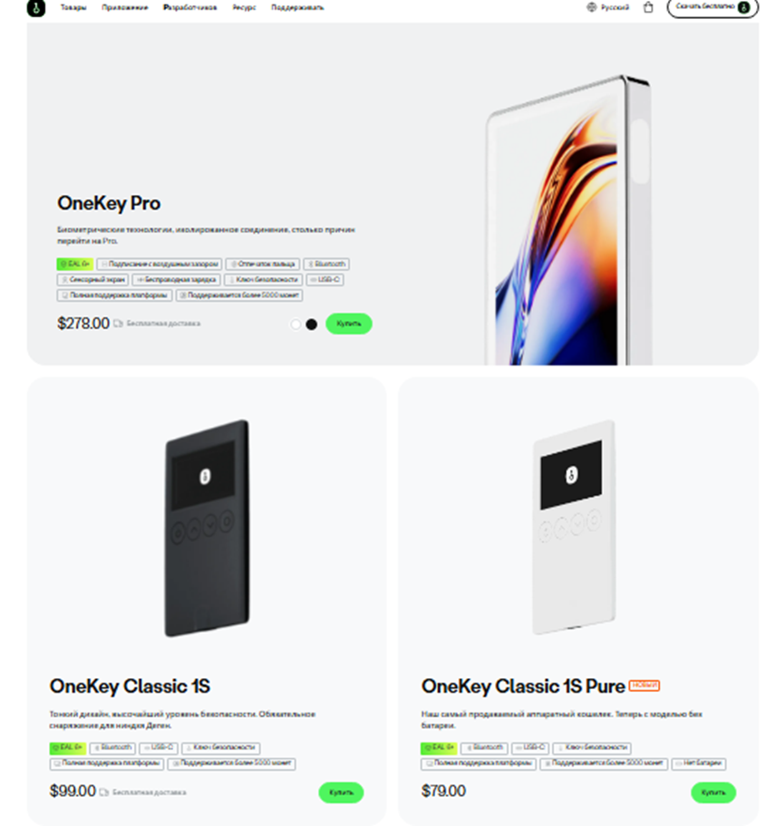 - OneKey Pro за $278 —передовой продукт компании с биометрической защитой, изолированным соединением, поддержкой воздушной подписи.
