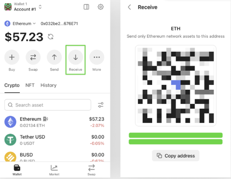 Для пополнения криптокошелька достаточно внести цифровые активы на индивидуальный адрес в выбранной сети, который сообщает программа. Для удобства пользователя можно отправить крипту по QR-коду с экрана приложения.