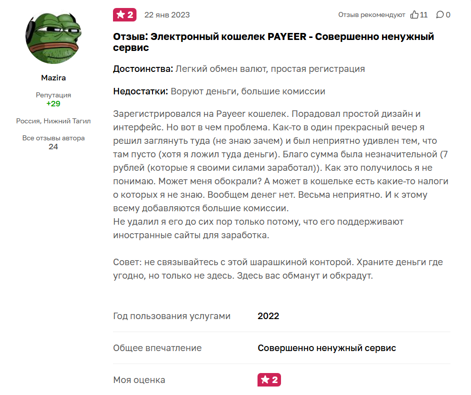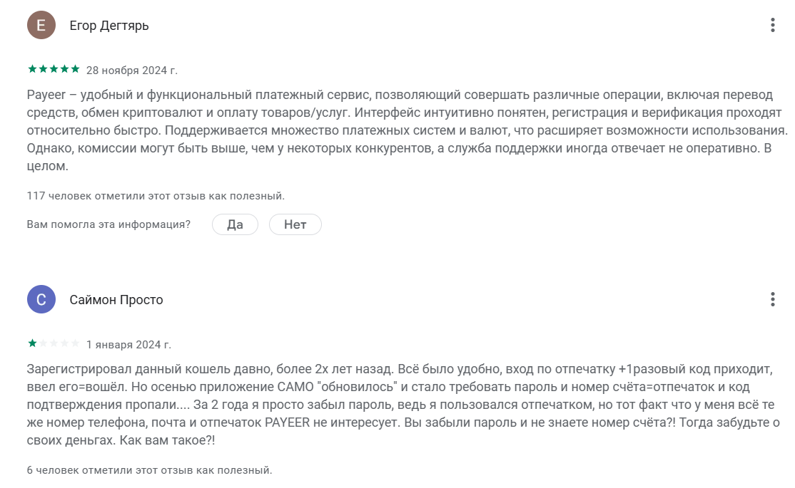 Здесь же есть и положительные мнения, в которых кошелек «Пейер» вообще не называют лохотроном – там говорится, что это удобный и функциональный платежный сервис, но следом идет отрицательный комментарий, где юзер недоволен тем, что он забыл пароль и не может получить доступ к своим средствам.