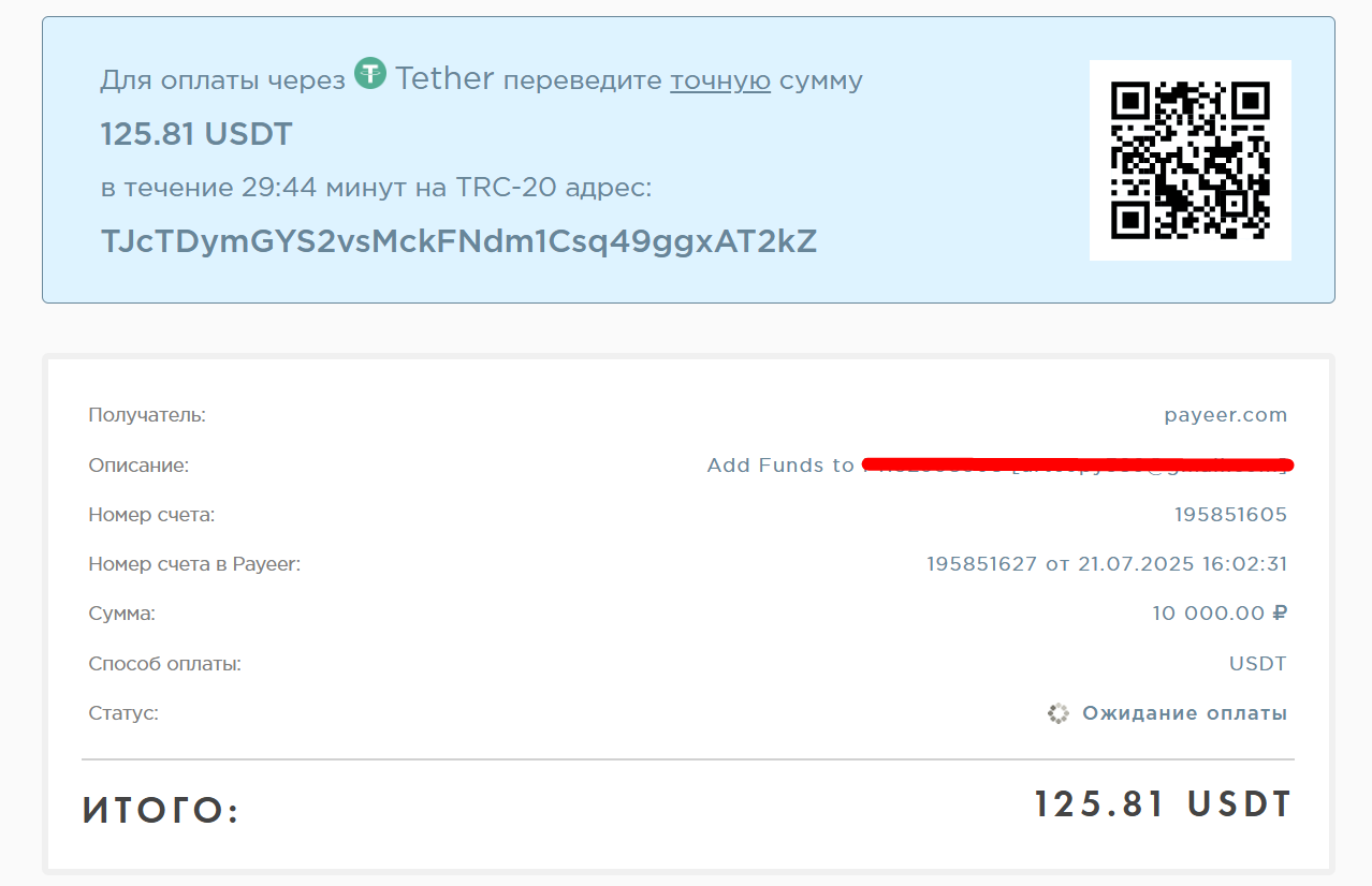 - В разделе кошелька «Пайер» «Пополнить» выбрать валюту счета – USD, EUR, на 21.07.2025 пока RUB недоступен, а значит с карты жители РФ напрямую не могут пополнять баланс.