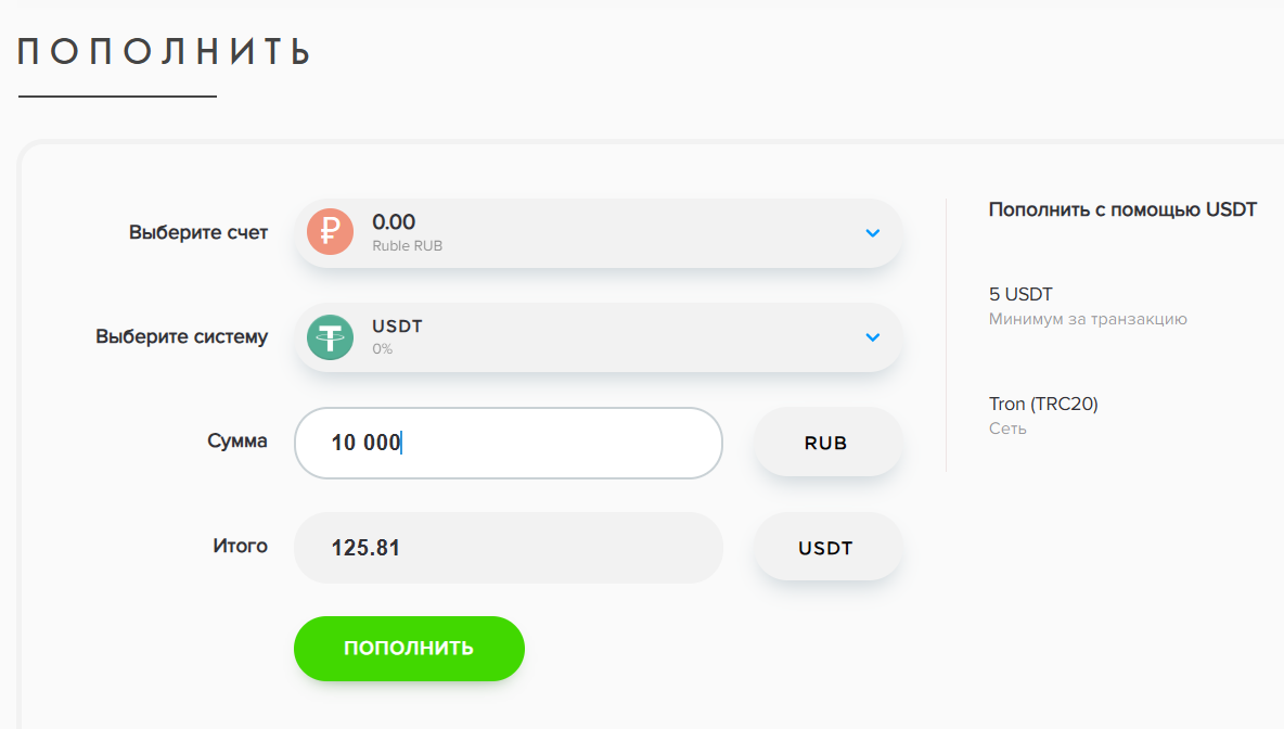 После этого уже нужно ввести непосредственно сумму желаемого зачисления, например, ₽10,000 и автоматически будет подставлено количество монет USDT, которые нужно внести.