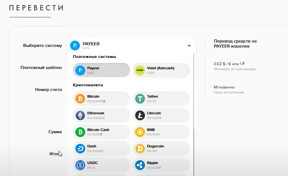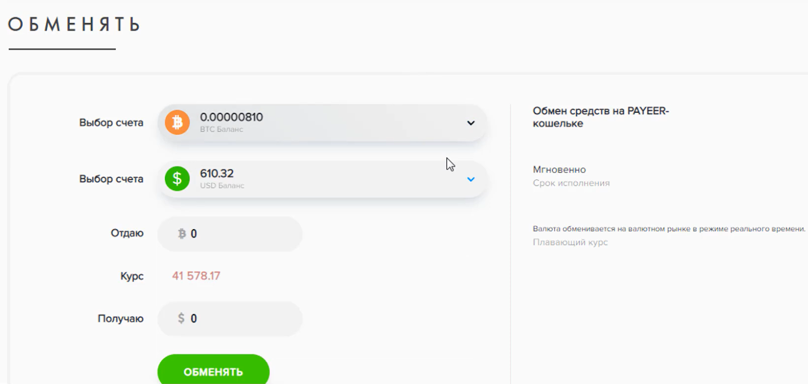 В Payeer можно быстро обменивать валюты внутри своего аккаунта, например, перевести доллары в биткоины или рубли в USDT. Все делается прямо в интерфейсе кошелька: выбираете, с какого счета списать, в какую валюту перевести, и система сама все посчитает.