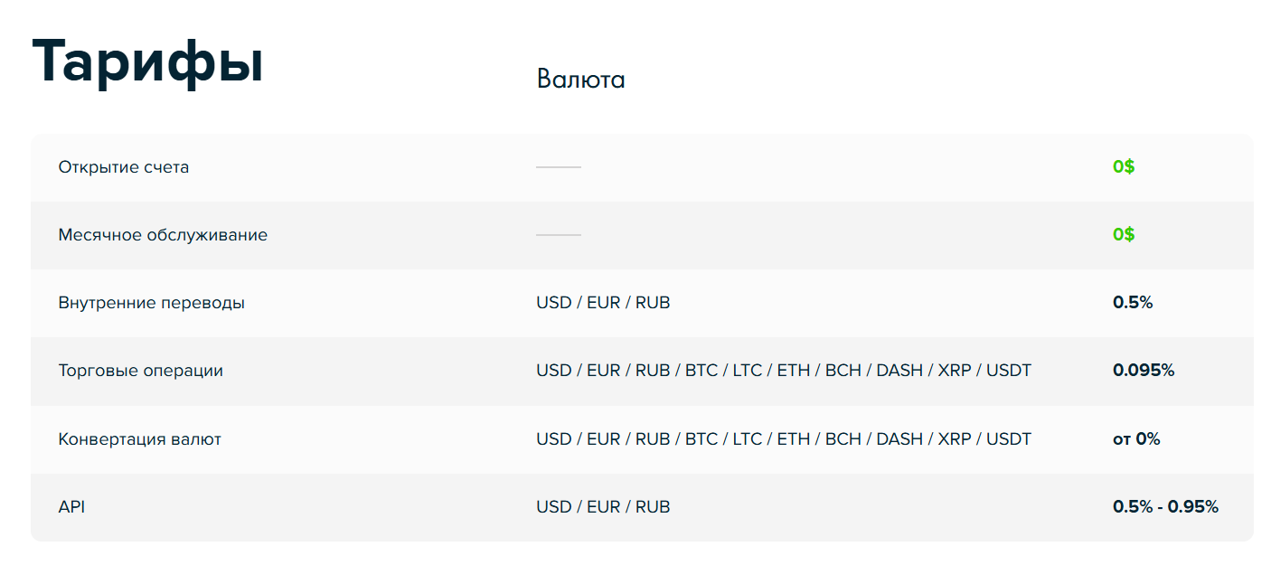 - Внутренние переводы валюты: USD, EUR, RUB – 0,5%.