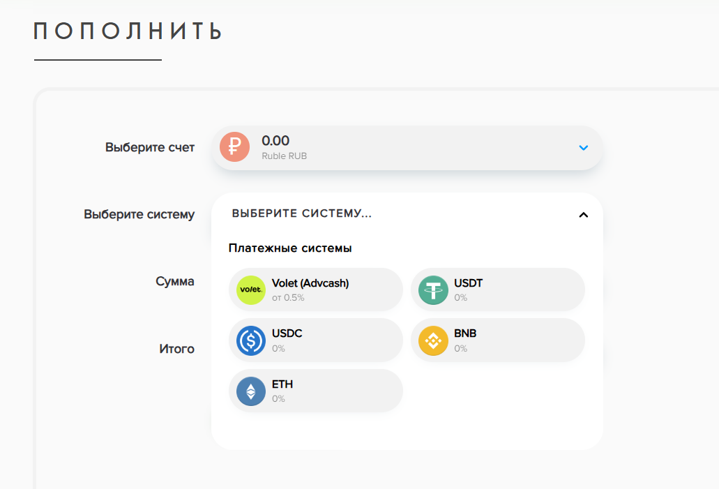 - Пополнение через банк, карту, криптовалюту или P2P.