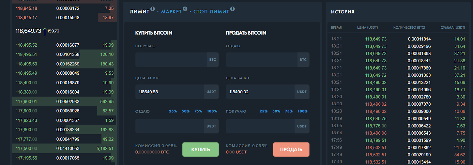 - Выставлять лимитные ордера, задавая цену покупки или продажи вручную.