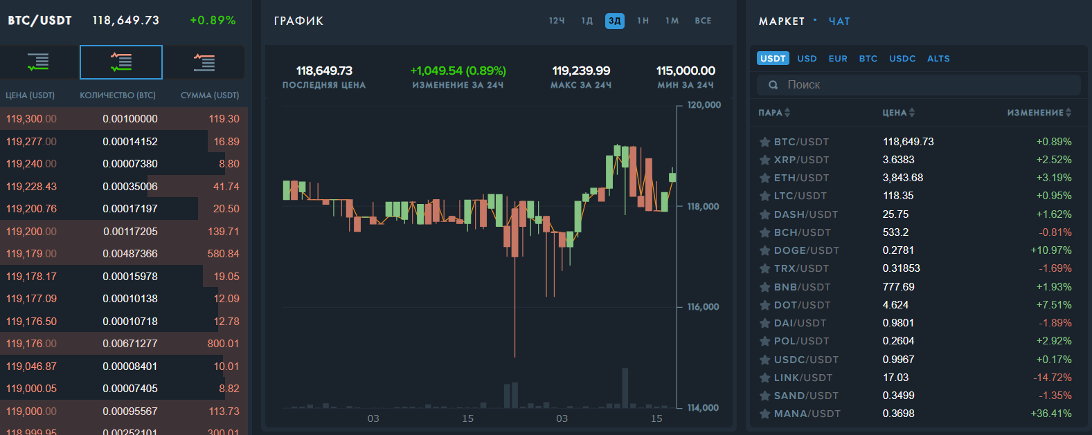 У Payeer Wallet есть также собственная биржа. Пользователям доступна классическая торговая панель с графиком, ордерами, стаканом и выбором типа заявок. В режиме реального времени отображаются актуальные курсы монет и токенов, но их количество не озвучено – видно, что есть лишь самые популярные цифровые активы, например, мемокинов не представлено.