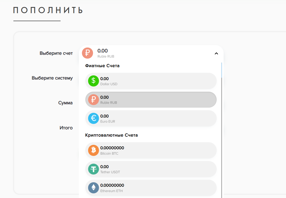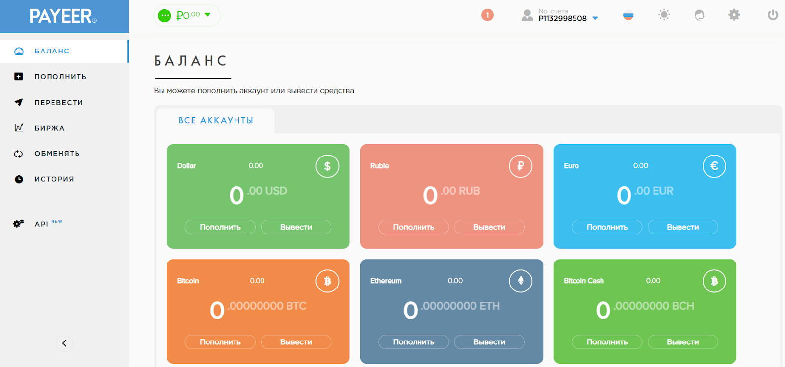 Попадая в личный кабинет пользователей встречает простой и интуитивно понятный интерфейс сервиса и страница с балансом. В центральной части находятся все аккаунты – так здесь называются отдельные счета в разных валютах и криптовлаютах.