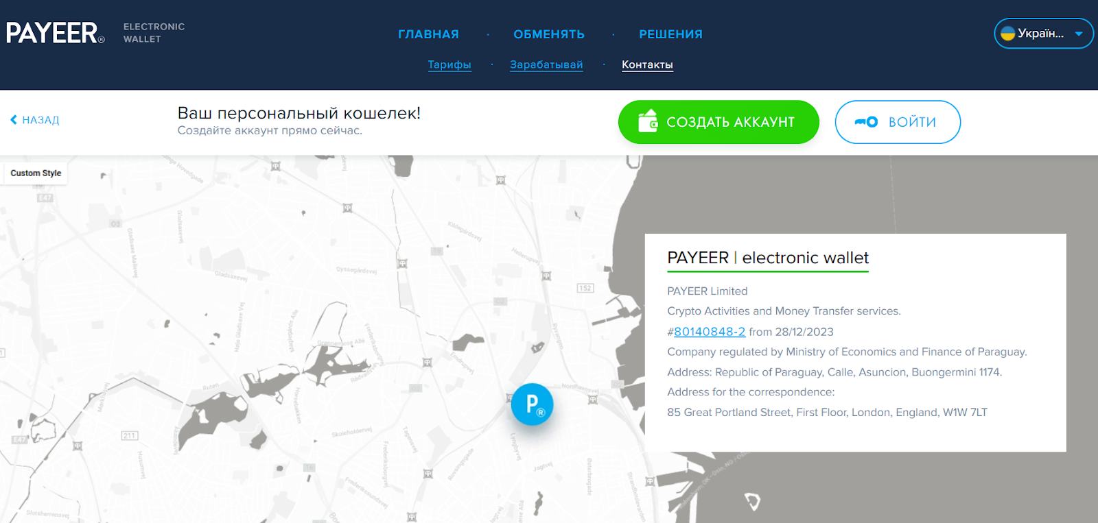 - Страна, где зарегистрирован Payeer, это Парагвай, но есть адрес для связи в Лондоне, а кто именно владелец не указано.