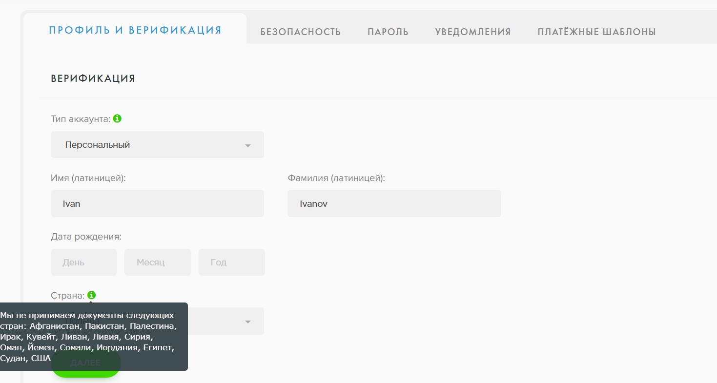 - После этого сервис попросит заполнить анкетные данные – имя, фамилия, страна и будет доступно подключение.