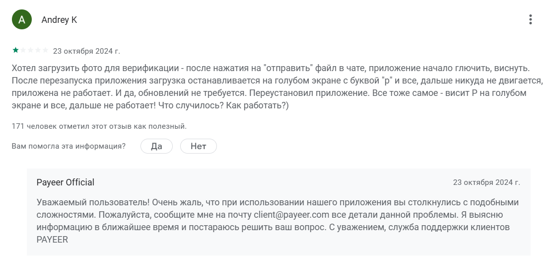 Тем не менее сами комментарии весьма неоднозначные – есть критика на технические сбои в работе мобильного приложения, которые одному из клиентов не дали пройти нормально верификацию. Представитель разработчиков кошелька старается отвечать на такие жалобы и предлагает помощь через email client@payeer com.
