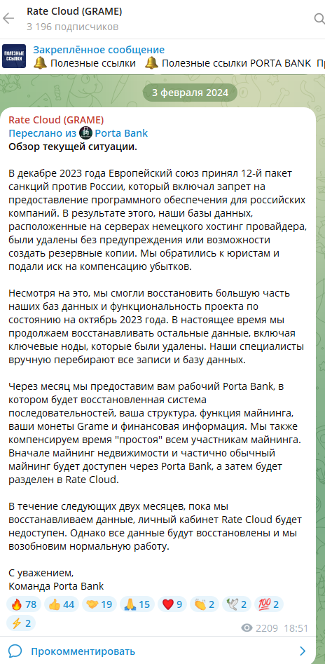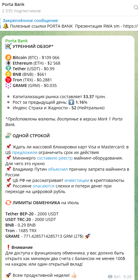 Помимо этого на канале Rate Cloud GRAME размещаются курсы валют при покупке ее через Porta Bank, а также другая полезная информация для тех, у кого есть этот кошелек.
