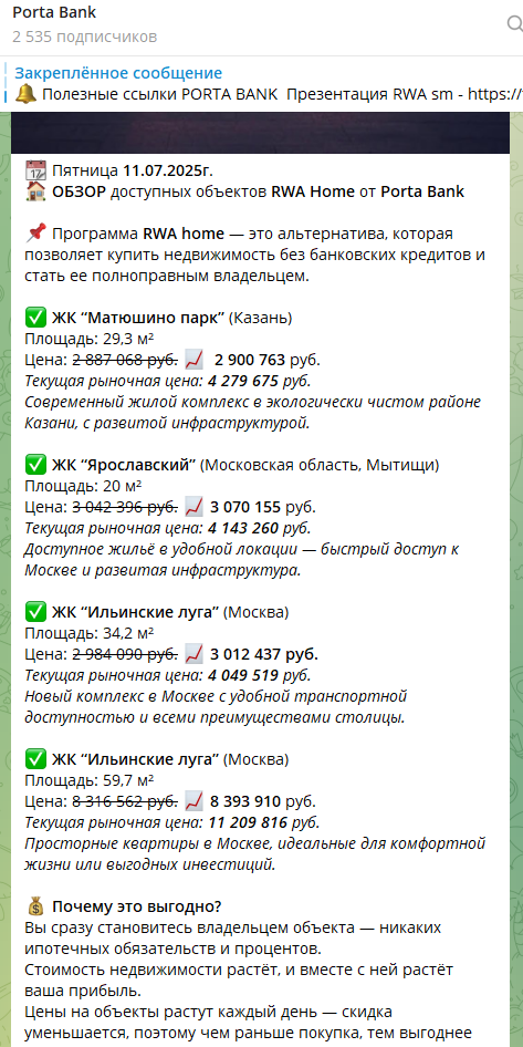 В последних публикациях размещены обзоры объектов недвижимости от программы RWA Home. По ней предлагается купить недвижимость без кредитов. В постах описываются разные ЖК, площадь объекта, его цена и краткая информация о нем.