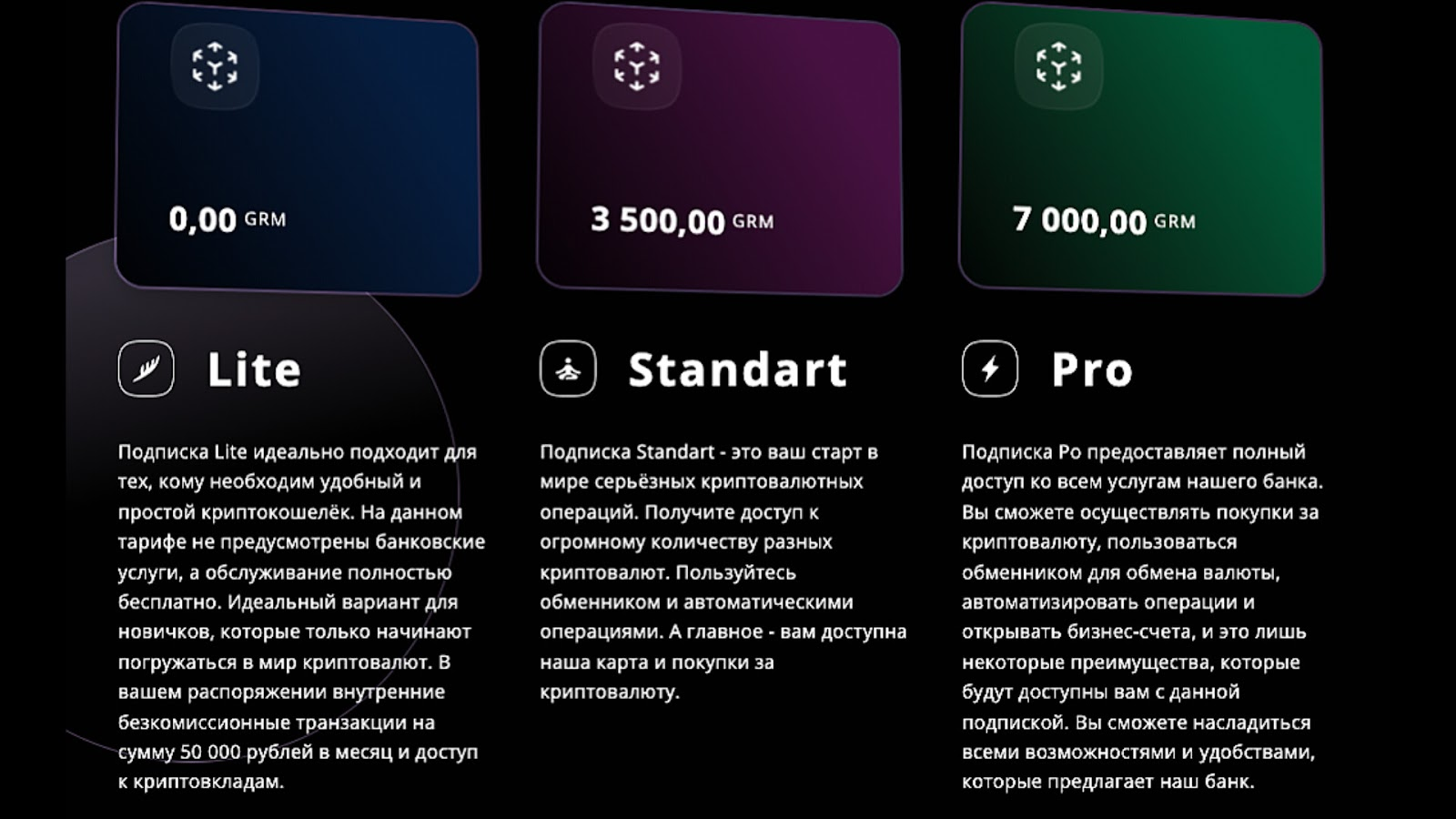 При выборе тарифа «Standart» клиент должен был внести оплату за него в размере 3,500 GRM и ему открывался выбор всех криптовалют, доступных на кошельке. На этом тарифе можно было пользоваться обменником и выпустить карту для оплаты покупок криптой.
