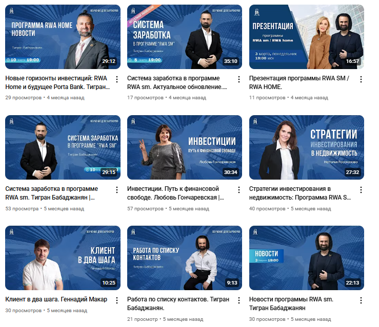 Также у сервиса есть YouTube-канал, на котором почти 2 000 подписчиков, но просмотры на видео достаточно низкие – редко набирают сотню. На видео якобы эксперты рассказывают об инвестициях в недвижимость, о системе заработка на программе RWA.
