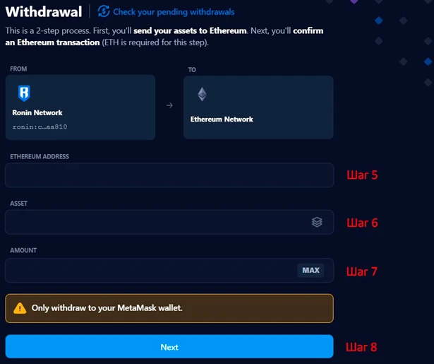 Для вывода в сеть Ethereum через Ronin Bridge) клиент должен сделать так: