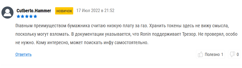 В положительных отзывах люди хвалят криптокошелек, но не доверяют ему. Клиентам нравится низкая комиссия за газ по сравнению с другими кошельками. Несмотря на то, что один из пользователей поставил ему 5 звезд, он утверждает, что не желает хранить в нем токены, так как кошелек могут взломать.