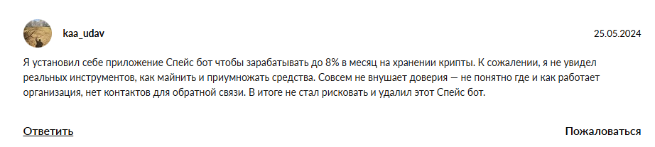 Юзер под ником Kaa_Udav в своем отзыве о SpaceBot говорит, что ему удалось установить приложение на смартфон, а причиной стала доходность в 8% ежемесячно. Инструментов для получения прибыли он не увидел, депозит вывести обратно так и не удалось.