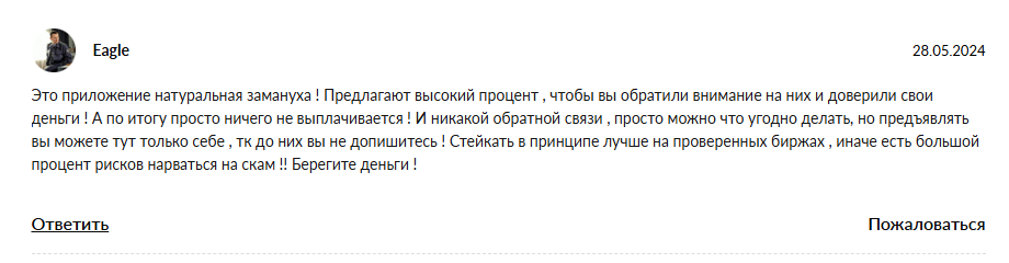 В Интернете нет положительных откликов от бывших клиентов кошелька, зато хватает отрицательных. Один из пользователей пишет, что команда заманивает высокой доходностью, но деньги не выплачивает. Он советует вкладывать токены в стейкинг только на проверенных биржах, чтобы не потерять капитал.