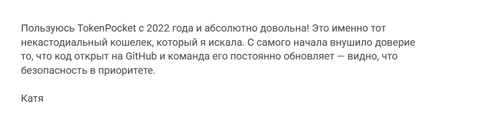 Пользователи довольны криптовалютным проектом для хранения монет. Один из клиентов утверждает, что сервис является тем, что он искал. Ему нравится то, что исходный код открыт, постоянно обновляется, тем самым увеличивая безопасность денег владельца, пишет он в отзыве о Token Pocket.