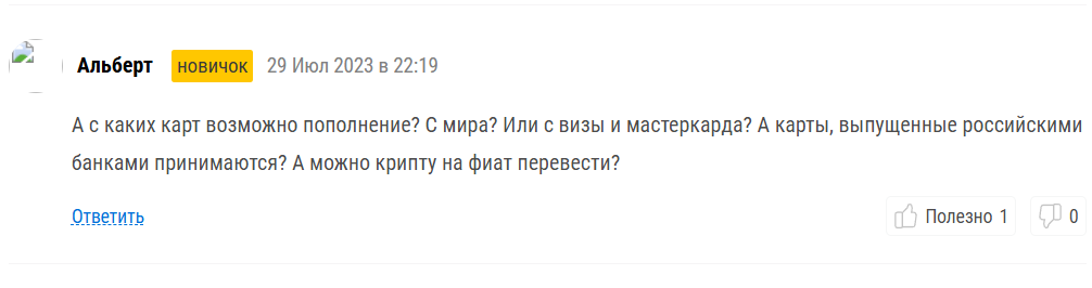 Еще один пользователь интересуется можно ли пополнять кошелек с карт МИР, интересуется можно ли перевести крипту на фиат.