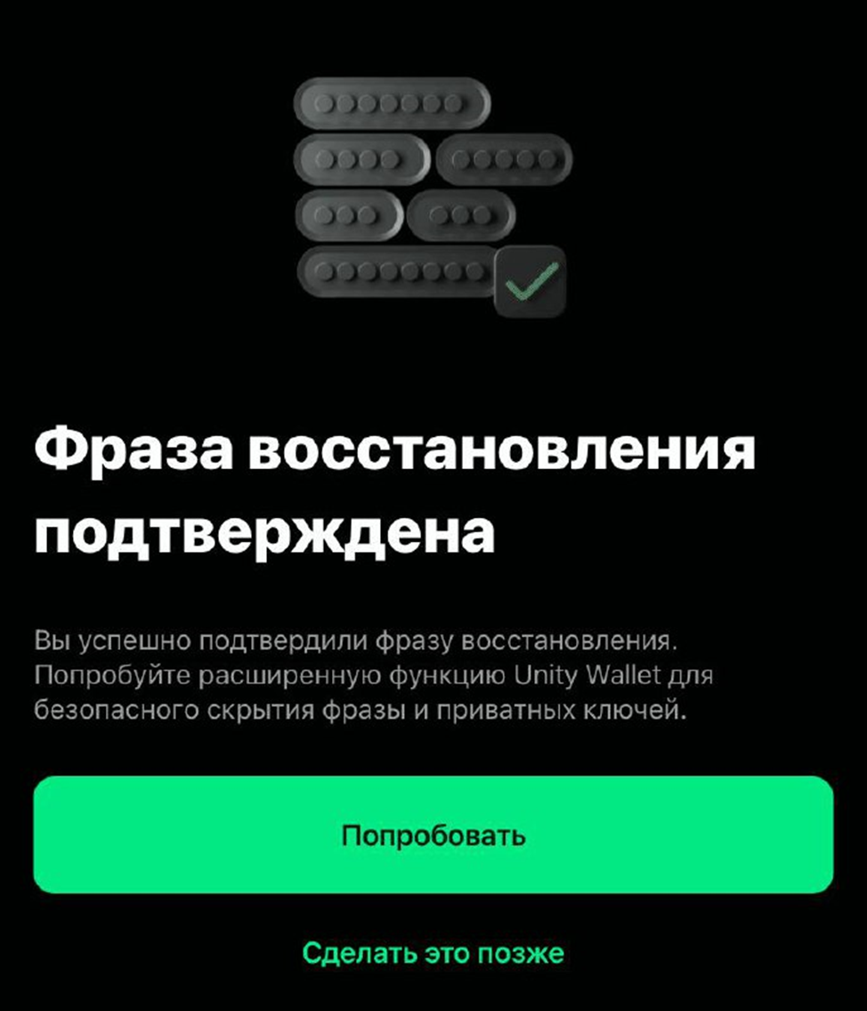 Вам не стоит хранить сид-фразу от Unity Wallet в формате фото или скрина. Лучше записать код на бумагу и спрятать, чтобы взлом вашего устройства не позволил мошенникам обогатиться. Пароль должен быть сложным, но настолько, чтобы вы его запомнили, иначе придется переходить к процедуре восстановления. Сразу после создания кошелька стоит настроить все возможные функции защиты.