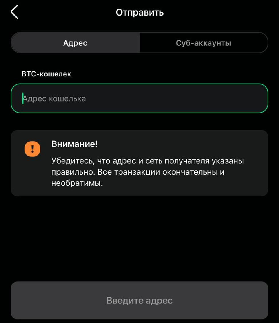 • Ввести адрес кошелька или выбрать другой суб-аккаунт, чтобы перевести активы.