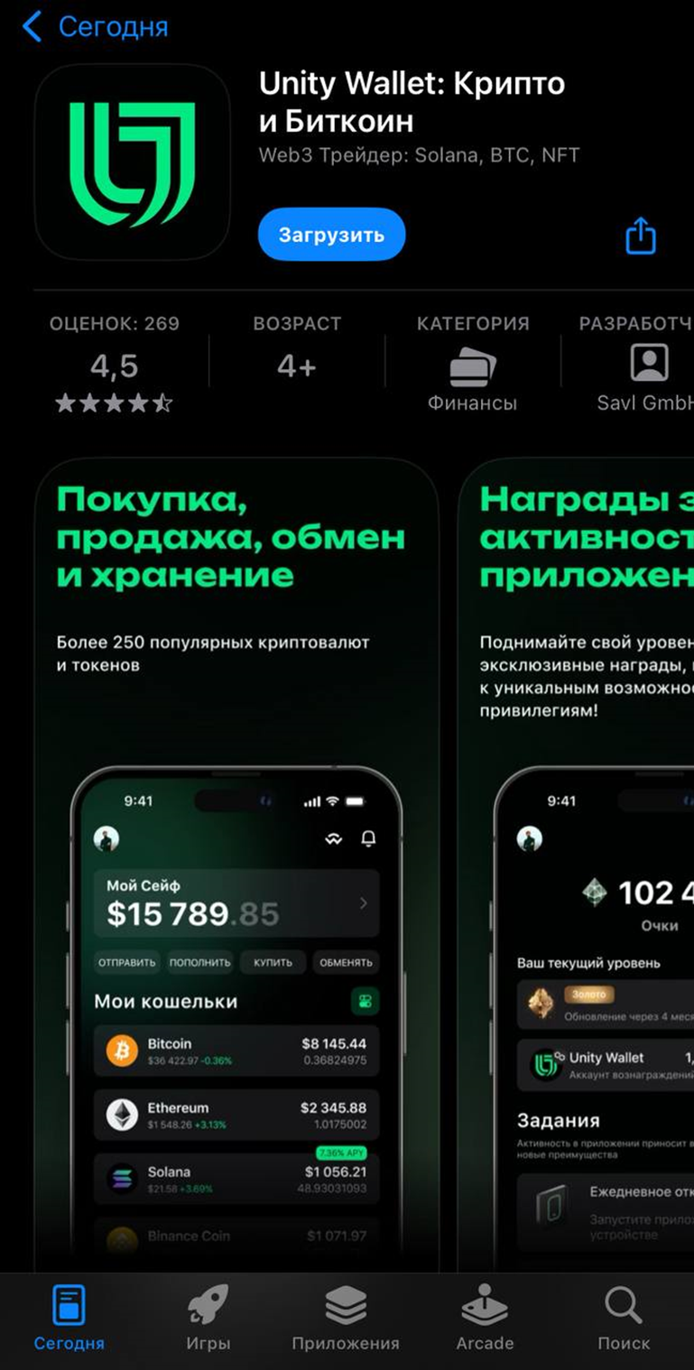 • Отсканировать QR-код на сайте UnityWallet com или перейти по ссылке в магазин приложений.