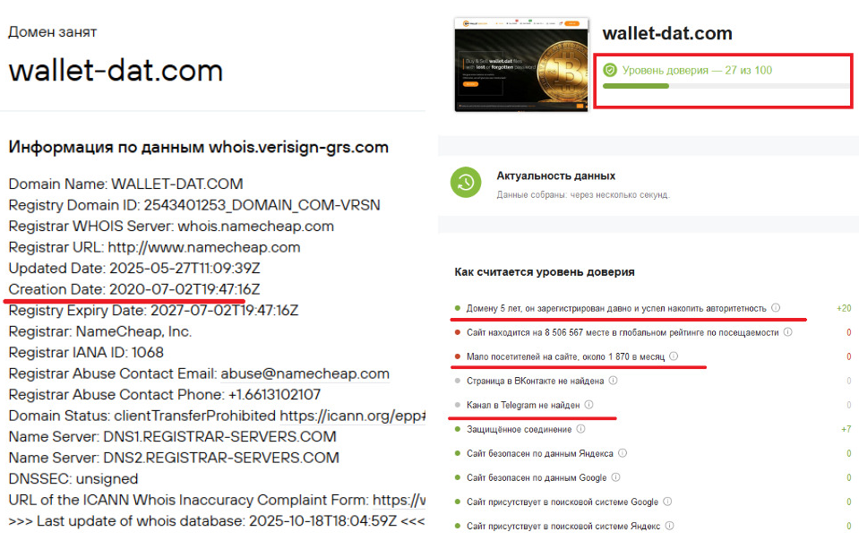 Сайт сервиса Wallet Dat Com создан более 5 лет назад и имеет средний уровень доверия согласно сведениям с сервисов мониторинга. Однако это не значит, что и сам ресурс так же надежен.