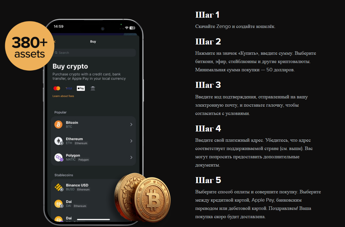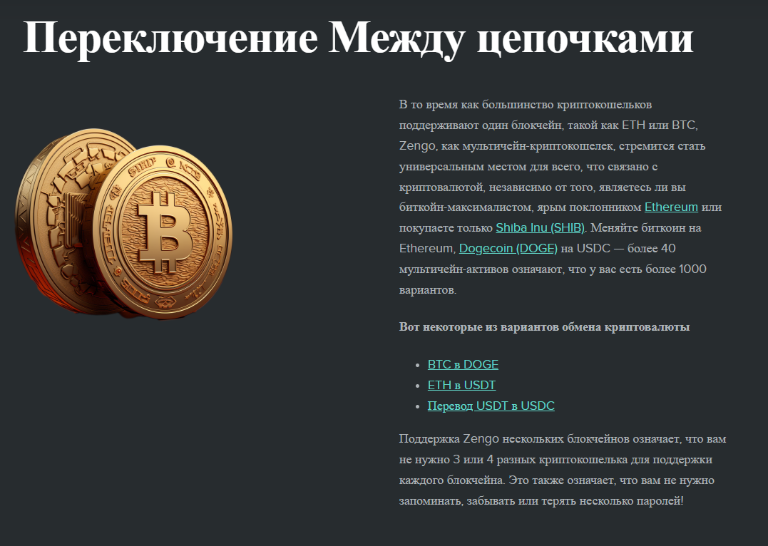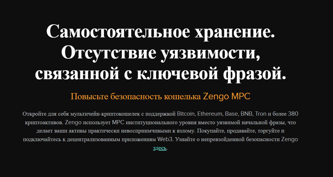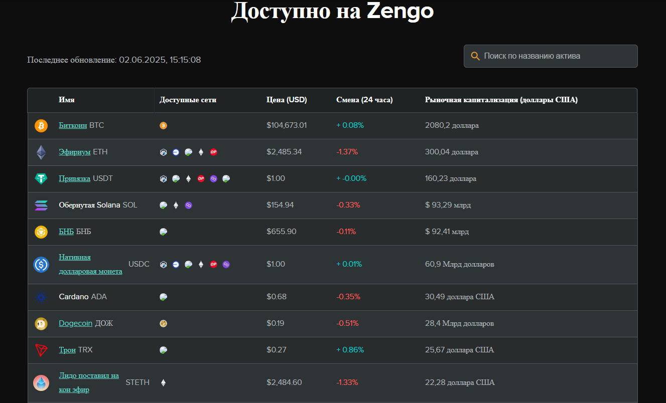 На сайте Zengo wallet говорят о том, что у пользователей есть доступ более чем к 380 криптоактивам, среди которых Bitcoin, Ethereum, Base, BNB, Tron и другие.