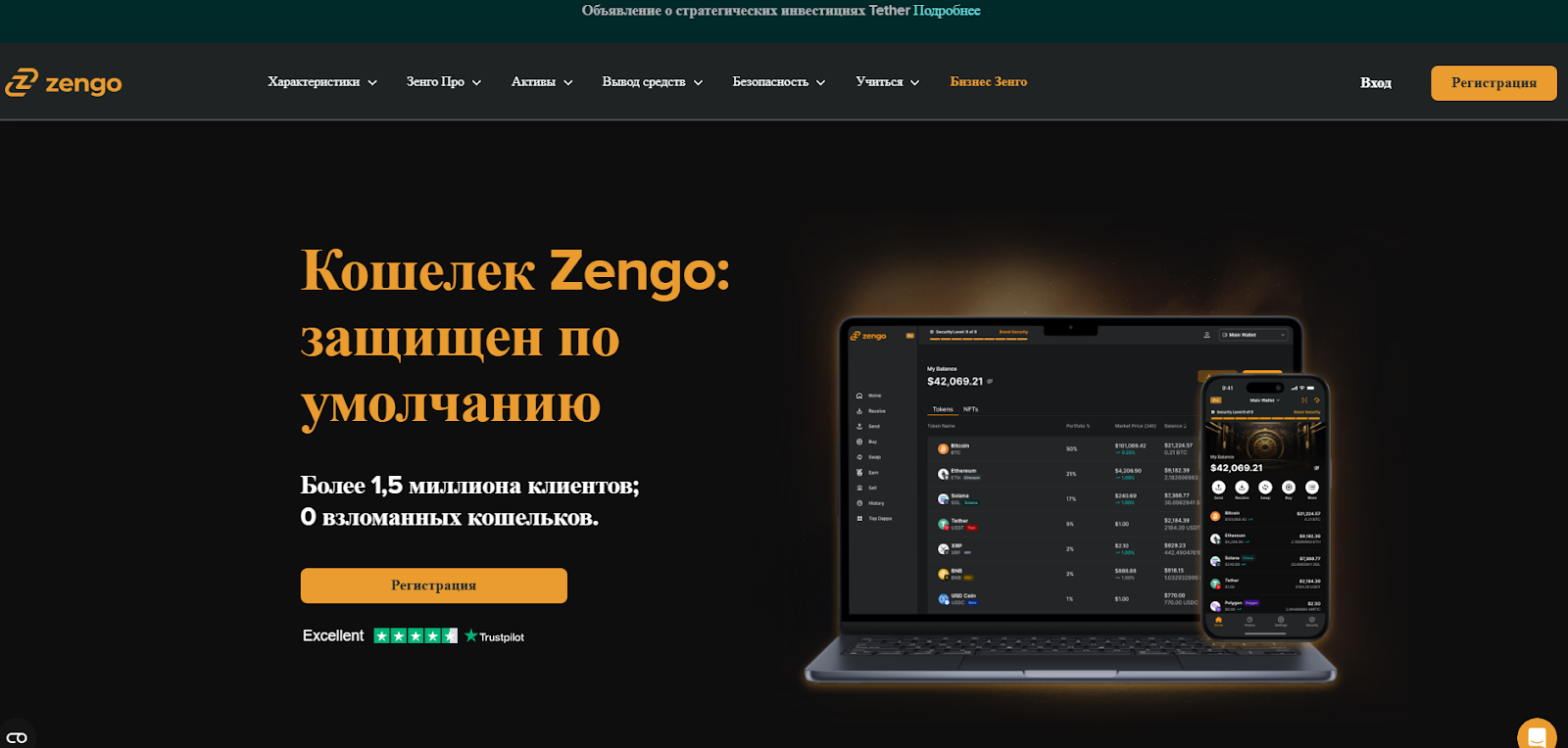 Официальный сайт криптовалютного кошелька 一 zengo com. Там можно получить основную информацию о проекте, а также зарегистрировать аккаунт. На главной странице гордо написано, что у проекта «1,5 миллиона пользователей и 0 взломанных кошельков».