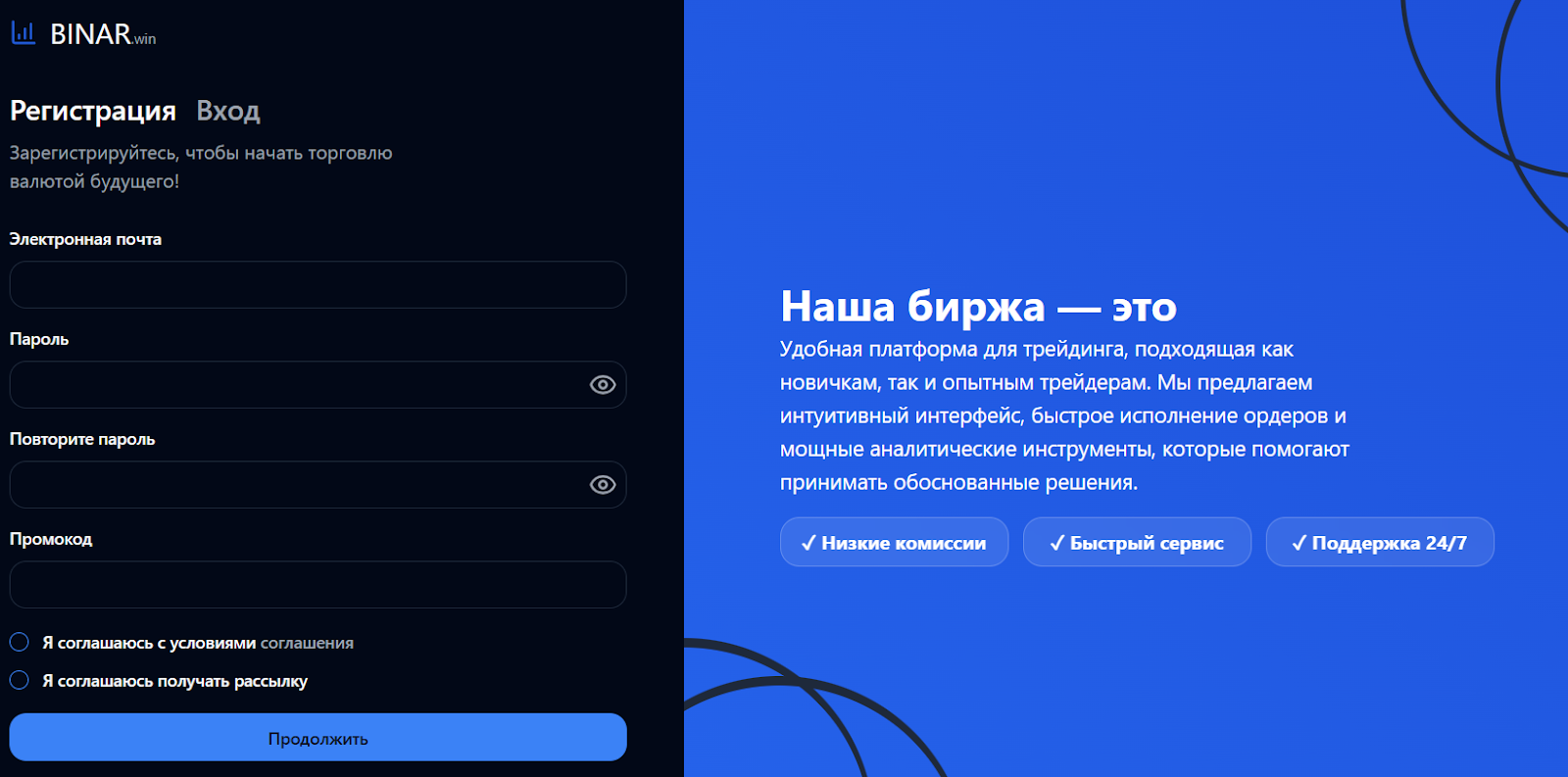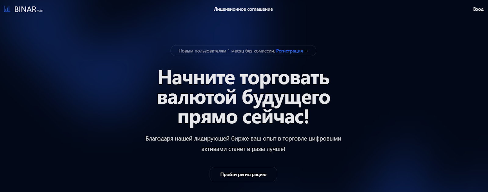 Официальный сайт Binar Win встречает пользователей призывом начать трейдинг на данной площадке, называя крипту валютой будущего. Сама биржа преподносится лидирующей компанией в сфере криптотрейдинга, но конкретных подтверждений этому нет.