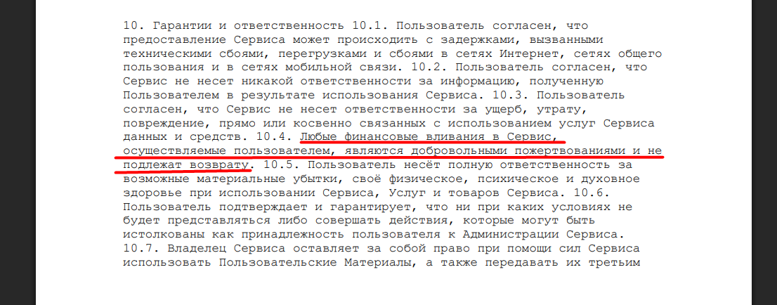Например, там говорится, что инвестиции в проект можно считать пожертвованием на добровольной основе.