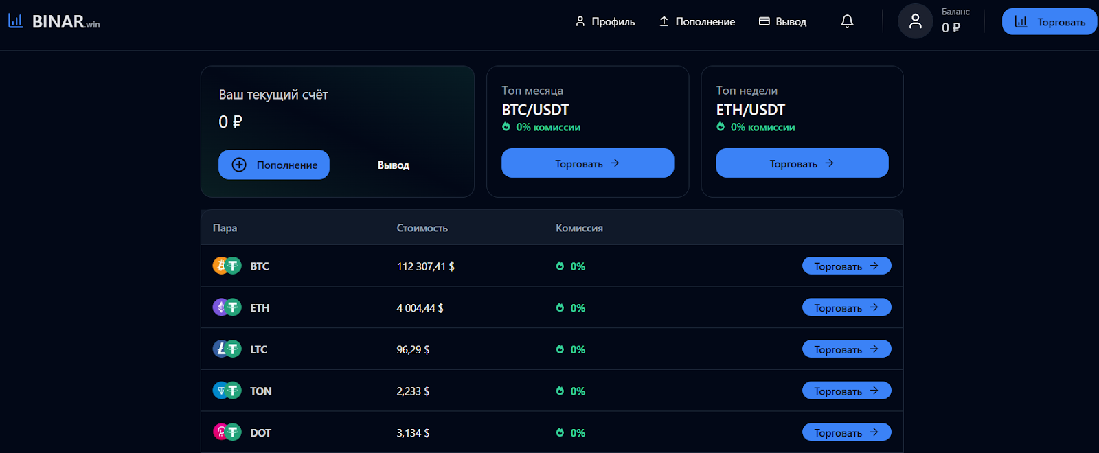 После авторизации на бирже Binar Win трейдера встречает внутренний торговый аккаунт. Он содержит несколько базовых функций: