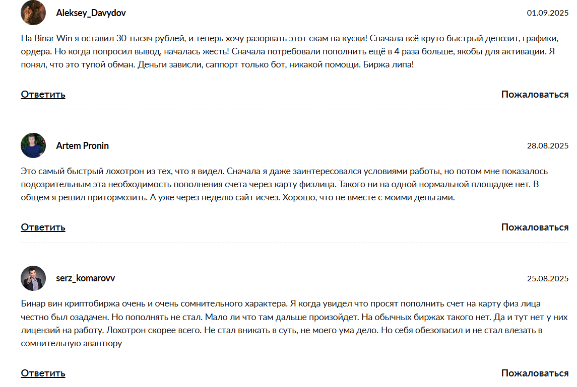 В Интернете уже можно обнаружить достаточно много отзывов о бирже Binar Win, причем, все они негативного характера. Люди пишут, что это лохотрон, анонимные авторы которого просят пополнить счет на карту физического лица.