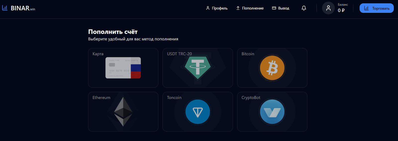 Чтобы пополнить баланс клиенту необходимо перейти в соответствующее меню «Бинар Вин» и выбрать удобный метод внесения депозитов из доступных, а именно: