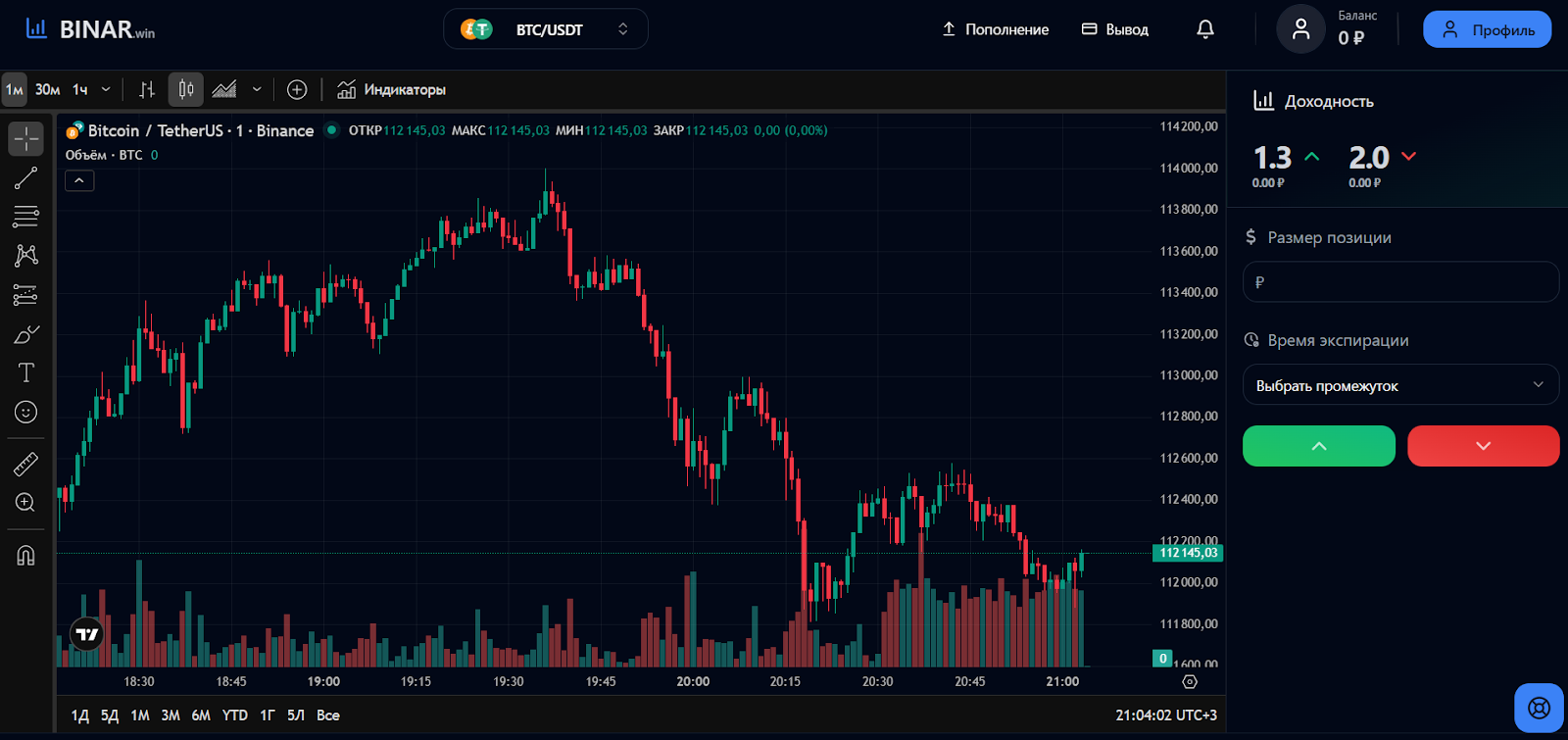 Выбрав раздел для трейдинга, перед пользователем открывается внутренний терминал Binar Win. Больше половины экрана занимает график торговой пары в реальном времени, где можно анализировать свечи и отыскивать паттерны. Справа можно выставлять позицию, указывая размер и время экспирации, а также задавать тренд.