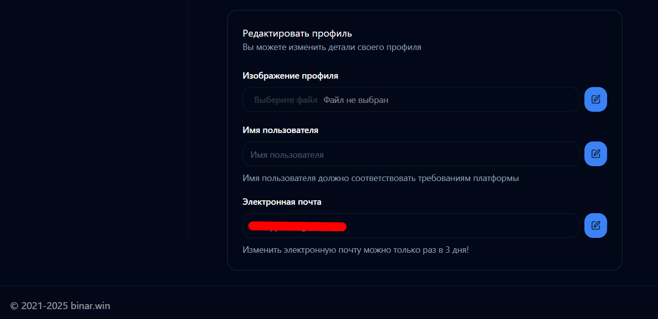 В меню, отвечающем за настройку профиля на бирже Binar Win есть возможность поставить изображение на аватарку личного кабинета, изменить имя, а также электронную почту, но не чаще, чем один раз в три дня.