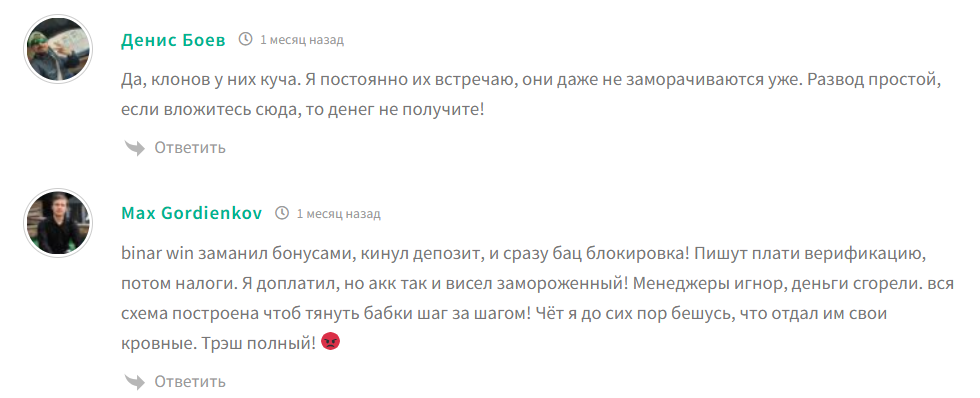 Некоторые отзывы о «Бинар Вин» свидетельствуют о том, что у данной биржи существует множество сайтов-клонов, которые создают мошенники на регулярной основе. Как только набирается множество критики, площадка перестает работать и запускается аналогичная.