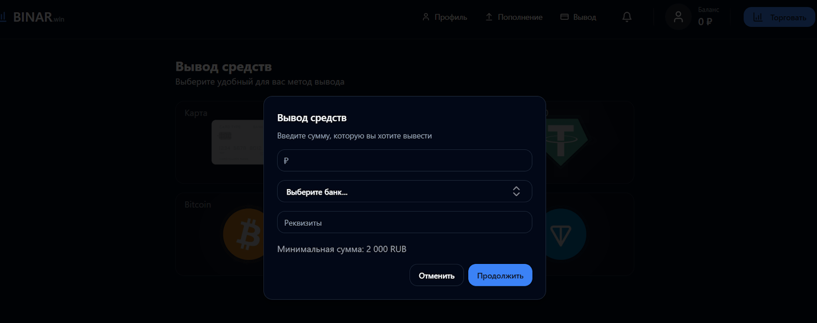 Чтобы вывести деньги можно использовать все те же самые способы, что и для транзакций по внесению средств на баланс Binar Win, но также добавлена опция СБП. Для заявки предлагают заполнить короткую форму, где нужно указать сумму на вывод и реквизиты.