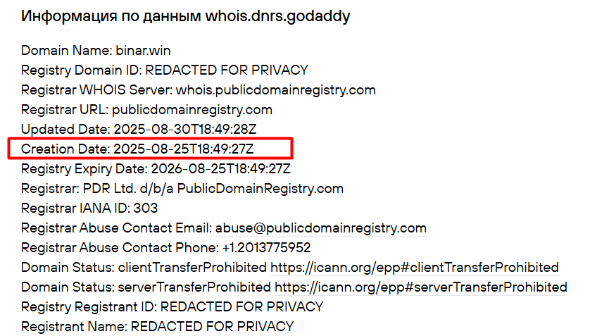На сайте проекта мало информации, например, ничего не сказано о владельцах и команде разработчиков биржи «Бинар Вин». Поэтому мы проверили сведения о площадке через сервис Whois. Проверка показывает, что ресурс был зарегистрирован только 25.08.2025, а информация об основателях скрыта в настройках.