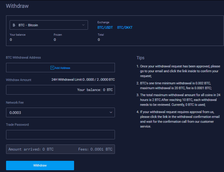 Процесс вывода похож, но вместо Deposit напротив криптовалюты нужно было нажать Withdraw. Затем указать адрес для перевода, обратить внимание на размер комиссии и подтвердить операцию с помощью торгового пароля.