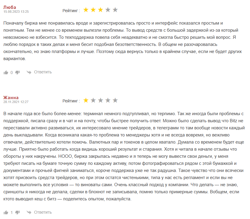 Если обратить внимание на отзывы о Bit Z Com, то можно проследить явную тенденцию: уровень обслуживания на площадке постепенно падал. Многие пользователи в ранних комментариях отмечали стабильную работу площадки, однако затем у многих начались проблемы с задержкой выплат и плохой работой технической поддержки. После закрытия криптобиржи в 2021 году некоторые трейдеры вообще не смогли вывести свои средства.
