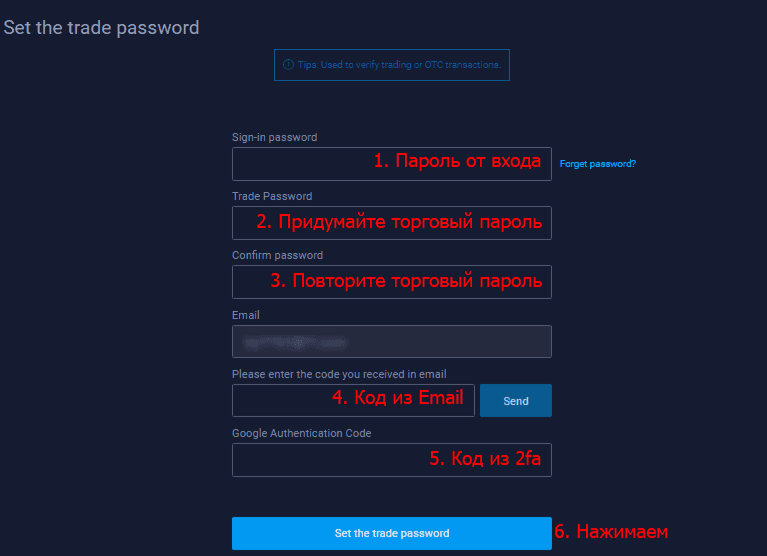 Для большей безопасности менеджеры советовали подключать и торговый пароль, перейдя в разделе безопасности в Trade Password. Там необходимо указать стандартный пароль от аккаунта и придумать тот, который будет использоваться при совершении сделок. Затем нужно подтвердить всё кодом из письма и установленного ранее Google Authenticator.